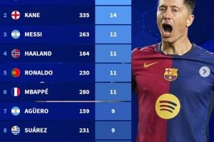 1、莱万 325场16次